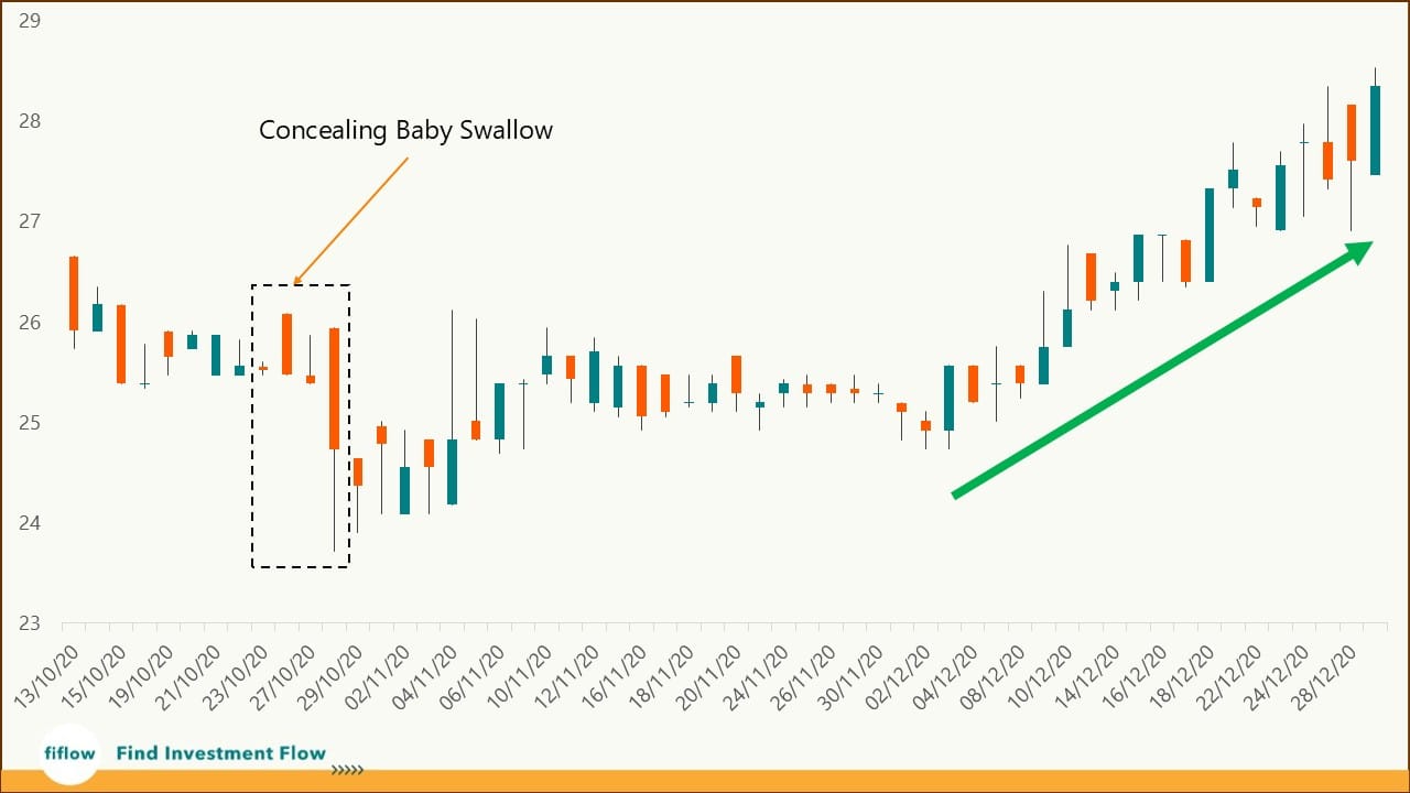 Mô hình Bullish Concealing Baby Swallow là mô hình đảo chiều tăng giá gồm bốn nến xuất hiện vào cuối xu hướng giảm. Nó cho thấy động lực giảm đang yếu đi và có thể có xu hướng tăng tiềm năng. Mô hình này hiếm gặp ở thị trường chứng khoán Việt Nam, nhưng chúng tôi vẫn có ví dụ để bạn có thể hiểu hơn về mô hình.