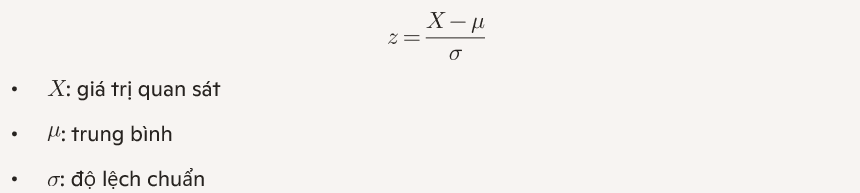 z‑score đo khoảng cách giữa một điểm dữ liệu và trung bình, sử dụng đơn vị là độ lệch chuẩn; giá trị dương cho biết điểm đó nằm phía trên trung bình, giá trị âm cho biết nó nằm phía dưới, và z = 0 nghĩa là đúng bằng trung bình. Công thức tính z-score: